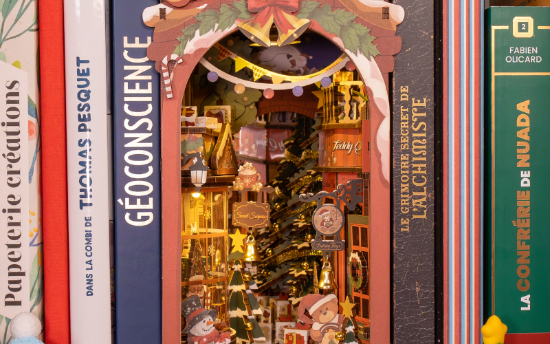 Nous sommes en décembre, alors c’était le moment parfait pour faire un book nook de Noël. C’est une scène miniature, une maquette en bois destinée à être placée dans une bibliothèque.
